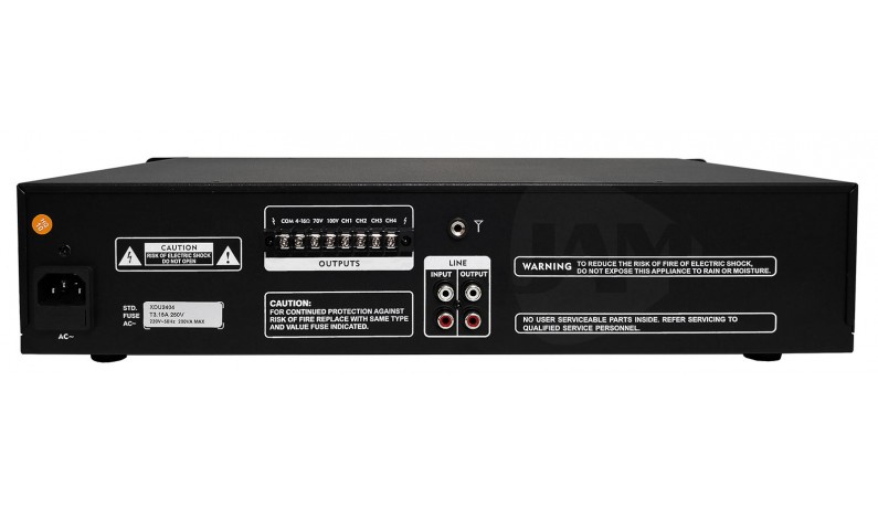 Підсилювач XDU1804 оснащений двома мікрофонними входами (вхід MIC1 має пріоритет), лінійним стерео входом, 2-смуговим еквалайзером а також має 4 вихідні групи з незалежним регулюванням гучності. А наявність лінійного виходу дозволяє об'єднати в єдиний ланцюг кілька підсилювачів для максимально зручної та гнучкої інсталяції.