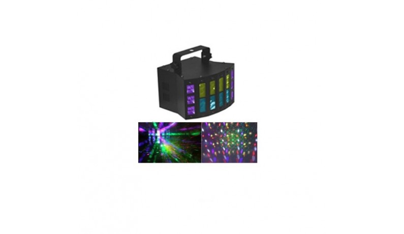 BIG MIXDERBY4in1 Світлодіодний прилад динамічний мультифункційний дербі, лазер, строб і ультрафіолетовий ефект, світлодіоди: 9*3Вт(дербі) 8*3Вт(строб і УФ), лазер: 150Мвт(червоний) 50Мвт(зелений), режими: DMX(10кан), Master-Slave, авто і звукова активація