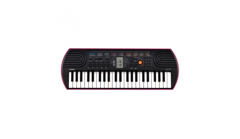 CASIO SA-78 Синтезатор з акомпонементом, 44 міні-клавіші блок живлення в комплекті, можливість роботи від 6 шт. AA (не в комплекті), вихід на навушники або лінійний 3,5мм, колір: чорний+рожевий.