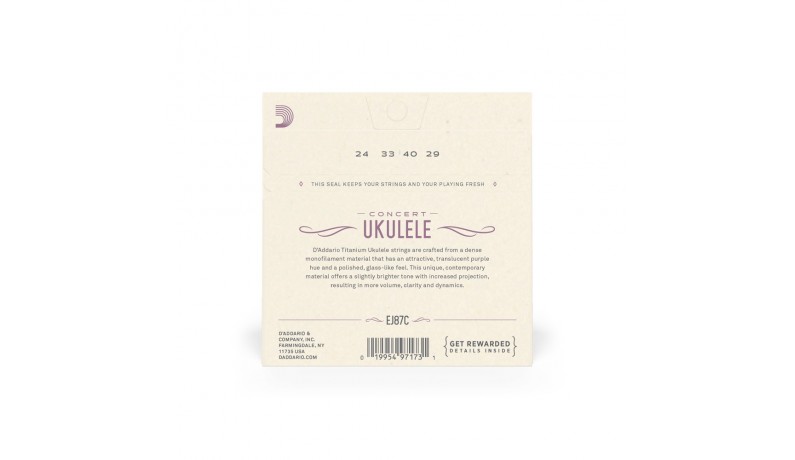 Струни D`Addario Titanium Ukulele виготовлені з щільного моноволокна з ефектним пурпуровим відтінком і гладким полірованим покриттям, схожим за відчуттям на нейлон. Цей унікальний матеріал прекрасно підходить для укулеле завдяки яскравому звучанню і збільшеній звуковій проекції, і в результаті створює велику гучність, чіткість і динаміку.