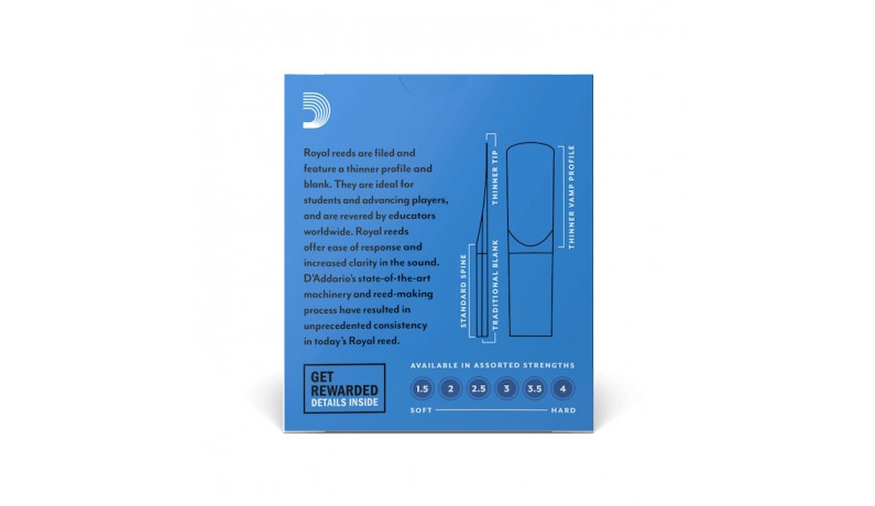 Тростини для саксофона D'Addario серії Royal мають подвійний (французький) зріз і тонкий профіль. Вони ідеально підходять як для початківців так і для професійних музикантів та рекомендуються викладачами у всьому світі. Тростини Royal поєднують легкість звуковидобування і чистоту звучання, а інноваційні високотехнологічні методи виготовлення, якими славиться компанія D'Addario, забезпечують стабільно високий рівень якості кожної тростини.