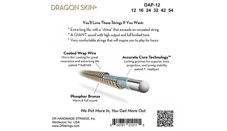 У Dragon Skin+ модернізовані як сердечник, так і обмотка, щоб вони були виключно музичними, збалансованими та гучними. Технологія Accurate Core Technology™ створює канавки на осерді, щоб утримувати обмотку, дозволяючи струнам звучати на повну силу.