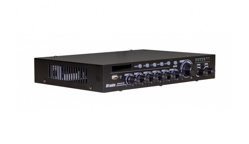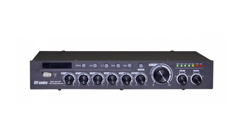 Мікшируючий підсилювач потужності DV audio DMA-60.2P з вбудованим USB-програвачем та FM-тюнером, а так само можливістю відтворення через BLUETOOTH. Застосовується в системах фонового озвучування. Оснащений двома мікрофонними входами, одним лінійним входом і лінійним виходом. Управління USB-програвачем здійснюється за допомогою кнопок stop / play, повтор, попередній трек, наступний трек з лицьової панелі підсилювача. USB-програвач підтримує USB-флешки максимальним об'ємом пам'яті до 16Гб. Управління FM-тюнером здійснюється так само з лицьової панелі підсилювача або з дистанційного пульта управління. Підсилювач виконаний в компактному корпусі висотою 1,5U для монтажу в рекову стійку не призначений.