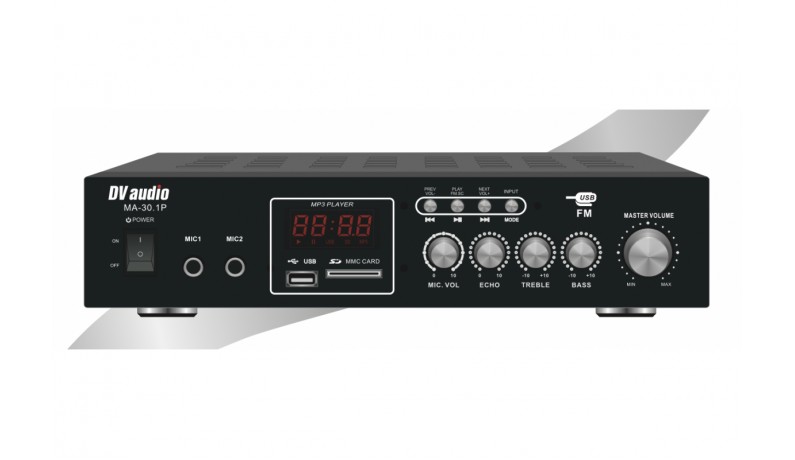 Мікшуючий підсилювач потужності DV audio MA-30.1P з вбудованим USB-програвачем та FM-тюнером, а так само можливістю відтворення через BLUETOOTH. Застосовується в системах фонового озвучування. Оснащений двома мікрофонними входами, двома лінійними входами і лінійним виходом. Управління USB-програвачем здійснюється за допомогою кнопок stop / play, повтор, попередній трек, наступний трек з лицьової панелі підсилювача. USB-програвач підтримує USB-флешки максимальним об'ємом пам'яті до 16Гб. Управління FM-тюнером здійснюється так само з лицьової панелі підсилювача або з дистанційного пульта управління. Підсилювач виконаний в компактному корпусі висотою 1,5U для монтажу в рекову стійку не призначений.