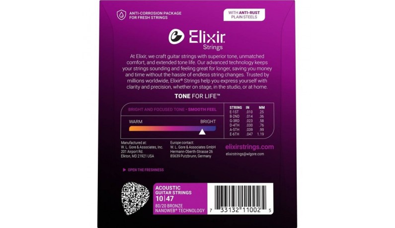 Elixir Nanoweb - струни для акустичної гітари із приголомшливо яскравим звучанням та вражаючою довговічністю. Ультра-тонке фірмове покриття Nanoweb захищає струни від впливу негативних факторів зовнішнього середовища (вологість, бруд, пил), що уповільнює їх окислення і подовжує їх життя в 3-5 раз в порівнянні з аналогами. Nanoweb заповнює проміжки в круглій обмотці, воно робить струни більше гладкими, що зменшує шум і тертя пальців при грі. Обмотка басів з 80/20 бронзи дає дзвінкий, теплий звук.