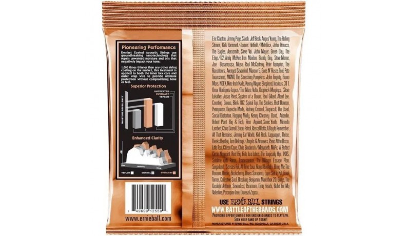 Обмотка струн Ernie Ball Everlast складається з фосфорної бронзи зі спеціальним покриттям. Завдяки революційної нанотехнології це покриття надійно захищає струни від попадання вологи, поту та бруду, які негативно позначаються на звучанні. Спеціальній обробці піддається як шестикутна сталева серцевина, так і обмотка з фосфорної бронзи. При цьому чудове звучання з теплим, багатим низом і чистим, яскравим верхом залишилося без змін, як і відчуття від гри.