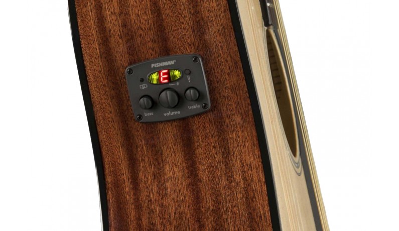 П'єзозвукознімач Fishman з підсилювачем і вбудованим тюнером оснащений зручними регуляторами для налаштування, при цьому зберігається чистий, густий і насичений звук з прекрасним резонансом. Бридж виконаний з палісандру, фурнітура - хромована. Венеціанський виріз з плавним вигином дає зручний доступ до верхніх ладів. Розетка красиво оформлена перламутром.