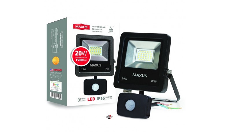 MAXUS 1-MAX-01-LFL-2050S Прожектор світлодіодний з датчиком руху 20W, 5000 K, IP65. Датчик винесено за корпус прожектора, його легко налаштувати, щоб попередити помилкові спрацьовування і заощадити електрику. Радіус виявлення - від 1 до 8 метрів; кут виявлення - 120°, для точного налаштування можна повернути блок сенсора по вертикалі або горизонталі; час затримки вимкнення - від 3 секунд до 5 хвилин; автоматичне включення при встановленому рівні освітленості, налаштовується в діапазоні від 10 до 2000 люкс.Світлодіодний прожектор з датчиком руху MAXUS 20W, 5000K (1-MAX-01-LFL-2050s) — це надійність, висока ефективність і якість світла. Модель виконана в ультратонкому корпусі, який буде непомітним на фасаді будівлі і має спеціальний кронштейн для зручного монтажу.