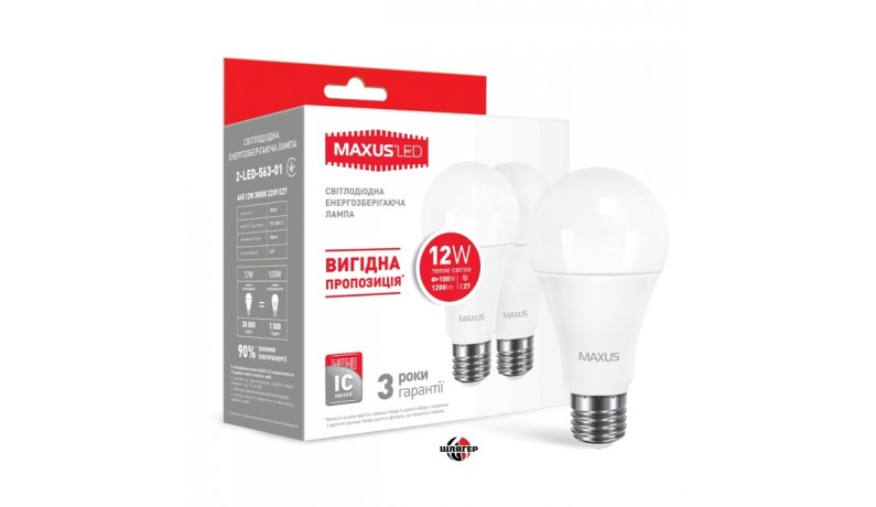MAXUS 2-LED-563-01 Лампа світлодіодна матова A65 12W 3000 K E27 1200Lm, кут розсіювання 270гр., набір з двох ламп.