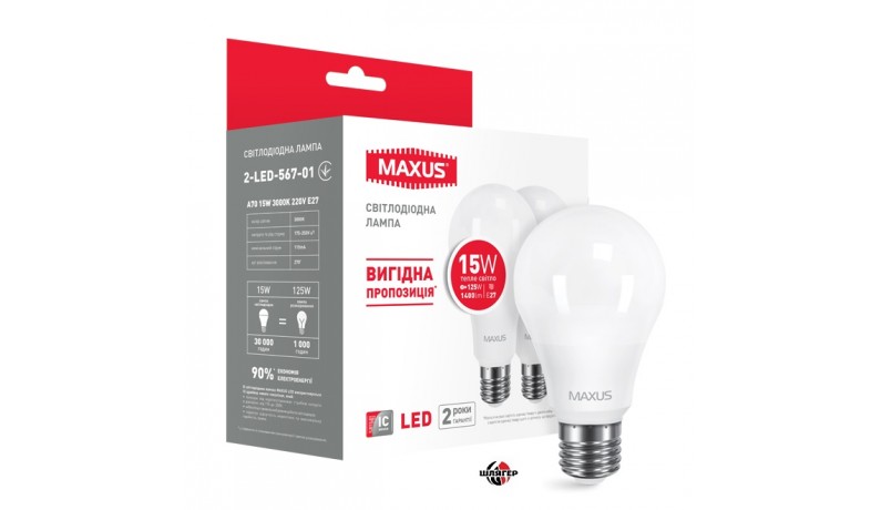 MAXUS 2-LED-567-01 Лампа світлодіодна матова A70 15W 3000 K E27 1400Lm, кут розсіювання 270гр, набір з двох ламп