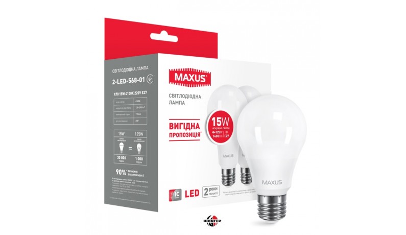 MAXUS 2-LED-568-01 Лампа світлодіодна матова A70 15W 4100 K E27 1400Lm, кут розсіювання 270гр, набір з двох ламп