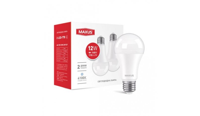 MAXUS 2-LED-778 Лампа світлодіодна A60 12W 4100K 220V E27 (в наборі 2 шт).