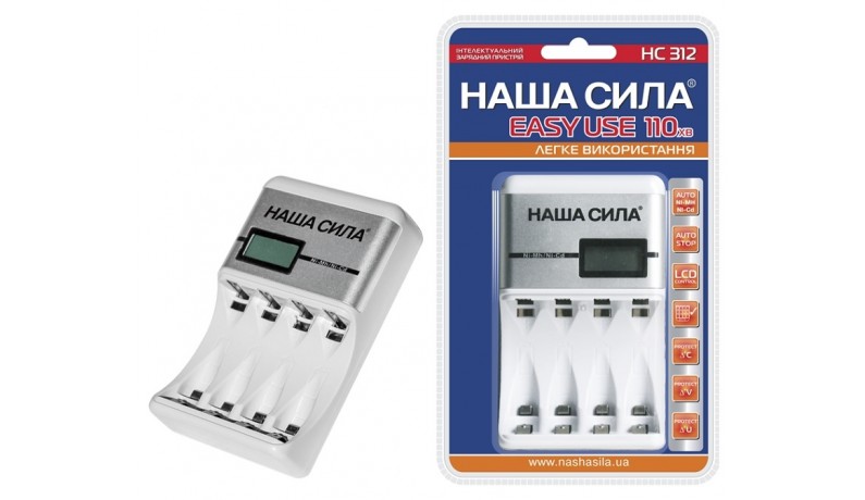 НАША СИЛА HC312 Зарядний пристрій для 2 або 4 акумуляторів AA/AAA, автоматичне визначення акумулятора, непридатного до заряджання, LCD індикатор заряду, автовимкнення після повного заряджання, захист від перегріву, перенапруги або перезаряду, без акумуляторів