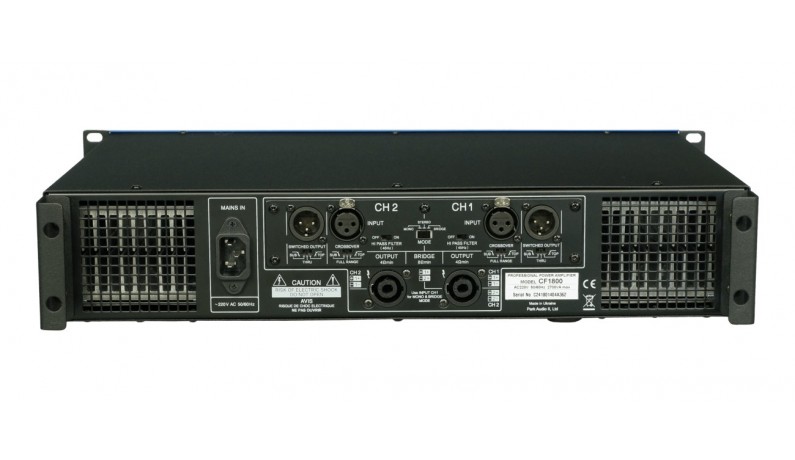 PARK AUDIO CF1800 Підсилювач потужності 2х900 Вт (4 Ом) / 2х500 Вт (8 Ом), 1450 Вт (міст 8 Ом), імпульсний Б.Ж. СF-серія - комерційна серія професійних підсилювачів потужності. Підсилювачі мають аналогову топологію: CF1800 клас H. Імпульсний блок живлення мінімізує вагу в порівнянні з класичним трансформаторним джерелом живлення. Підсилювач CF1800 має вбудований кросовер з перемиканнням лінійного виходу. Усі підсилювачі розроблені для роботи з навантаженням 4/8 Ом.