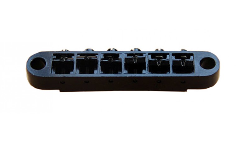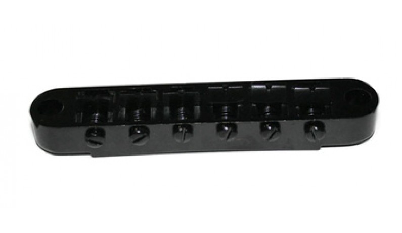 PAXPHIL BM022 BK Бридж для електрогітари. Tune-o-matic бридж для електрогітари Відстань між струнами - 10.4 мм Міжцентрова відстань посадочних гвинтів - 73.5 мм Діаметр посадочних - 6.3 мм Сідла з цинку Колір: чорний (BK