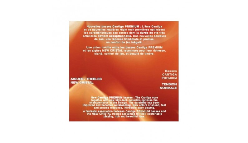 Нова серія струн для класичної гітари Savarez New Cristal Cantiga Premium пропонує чисте й багате звучання кожної ноти. Струни 1st - 2nd та 3rd виготовляються з високоякісного нейлону, який розроблений компанією Savarez й має назву New Cantiga. Нижні струни мають обмотку з посрібленої міді. Струни Savarez 510CRP мають сильний натяг.Ідеальне поєднання визнане у всьому світі за своє яскраве та чисте звучання. Сенсаційне відкриття. Нове комплексне ядро струни пропонує багатогранність можливостей та характеристик: колір, звучання, неймовірна віддача.