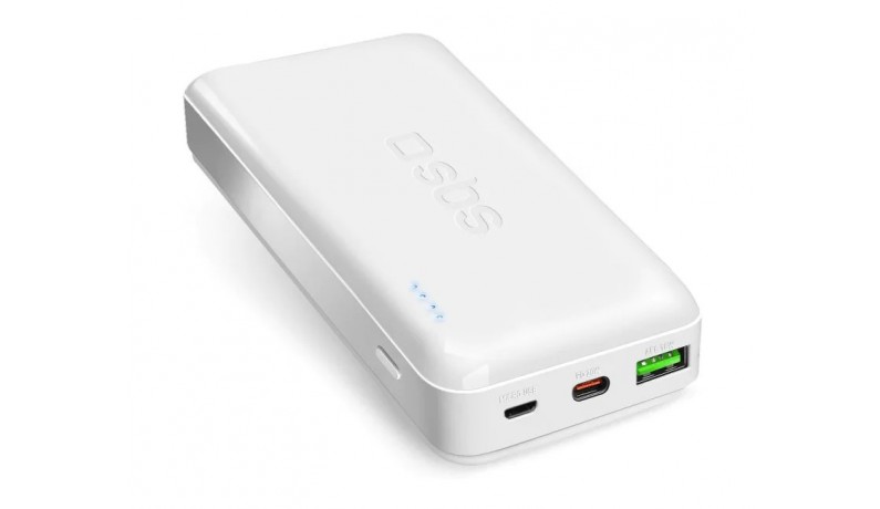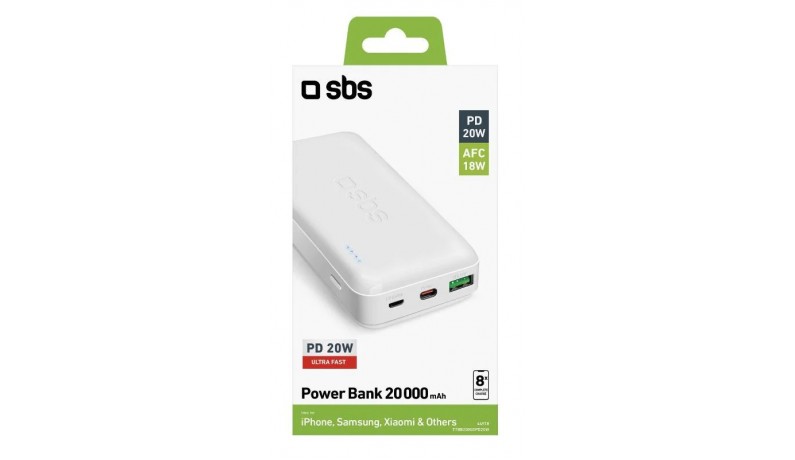SBS TTBB20000 mAh Fastk Батарея Power Bank 20000mAh. Швидка зарядка; Кількість пристроїв, що живляться: 2; Ємність [мАг]: 20000; Максимальний вихідний струм [мА]: 3000; Виходи, адаптери та кабелі: 1x USB Type A (powerbank), 1x USB Type-C (кабель), 1x USB Type-C (powerbank); Колір: білий