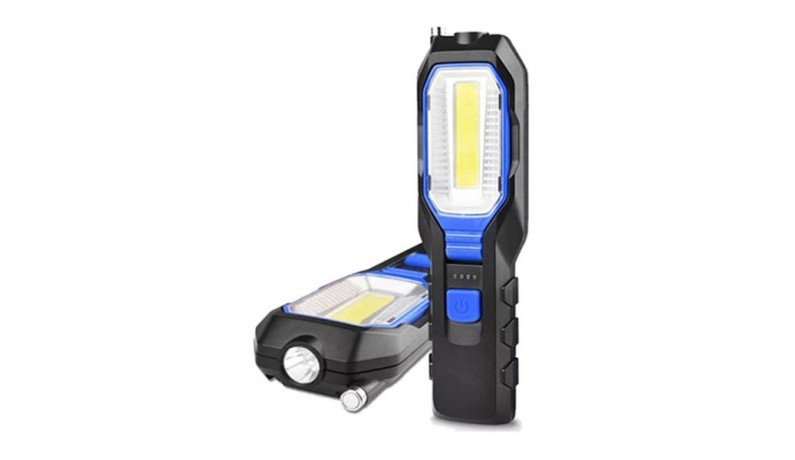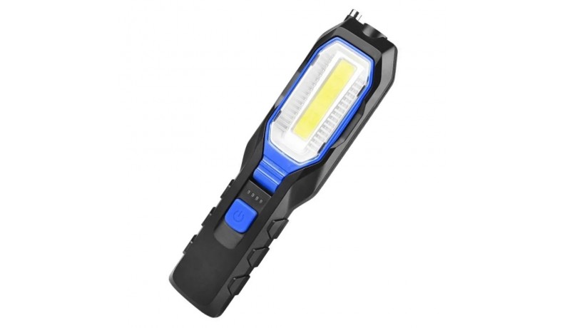 Ліхтар можна використовувати як зарядний пристрій для телефону та інших гаджетів. Характеристики: Лампа: COB LED + LED; Матеріал: АБС-пластик; Батарея: Вбудований акумулятор 2800mAh; Метод заряджання: через micro USB; Режими роботи: яскраве біле світло COB, тьмяне біле світло COB, яскраве біле світло, миготливий червоний COB; Колір: чорно- синій; Блок COB повертається на 90°, є магніт на телескопічній антені