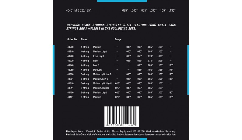 "Чорні" струни серії Black Label виготовлені з високоякісної нержавіючої сталі і виділяються разюче яскравим звучанням, яке ідеально доповнює агресивний характер фірмового тембру Warwick. Ці струни мають ретельно підібраний баланс, ідеально інтонують і відрізняються абсолютно приголомшливою динамікою. Саме тому струни Black Label за замовчуванням встановлені на всі німецькі бас-гітари Warwick серії Teambuilt. Виготовлені в США.