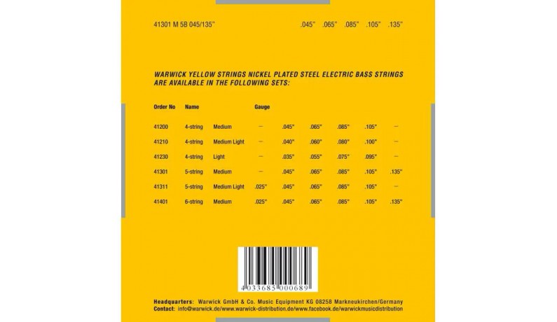 "Жовті" струни серії Yellow Label отримали обмотку з нікельованої сталі і мають найм'якіше звучання з усього модельного ряду Warwick. Масивний глибокий бас доповнюється виразною серединою і делікатними верхами, даючи в сумі традиційне звучання бас-гітари, яке ідеально підходить для класичного року, джазу та фанку. Вивірений баланс та ідеальне інтонування з великим динамічним діапазоном гарантують те, що звучання твого інструменту буде чутно навіть в самому щільному міксі. Виготовлені в США.